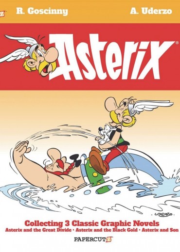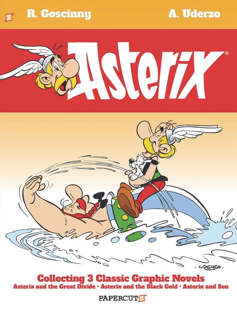 Contains 3 newly-translated classic Asterix tales. Asterix is a fearless Gaul with a magic potion that grants him incredible strength to protect his village and ward off Roman Empire from invading. With his pal, Obelix, the defend their village from not only the blundering Roman legionairies, but also lend their services to the rest of the world. First, Asterix and Obelix take on a new career as matchmakers as they help star-crossed lovers take on their warring factions. Perhaps Panoramix can whip up a love potion? Can the power of love cross 'The Great Divide'? Second, Asterix and Obelix must go drilling for Oil to fulfill a druid recipe, but to get 'The Black Gold,' they have to outwit a spy with his cutting edge ancient spy technology. Well, at least Obelix has his brute strength. Then, third, when a baby shows up at Asterix's front door he is thrust into fatherhood, but you know what they say, it takes a village. Is this more psychological warfare from the Romans or just the miracle of birth? Plus: a new Afterword by Alexander Simmons providing historical and cultural context for Asterix, both in 50 B.C. and in the time the classic comics were made.