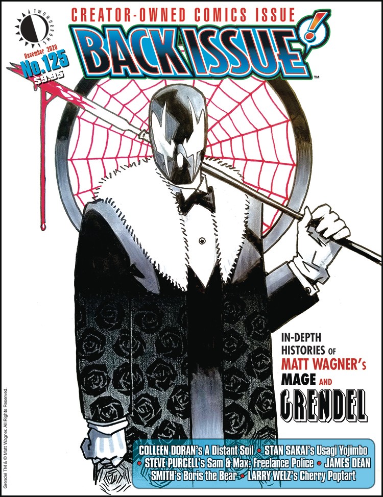 Back Issue takes a stab at the evolution of Creator-Owned Comics, featuring in-depth histories of Matt Wagner's Mage and Grendel. Plus other indie sensations of the Bronze Age, including Colleen Doran's A Distant Soil, Stan Sakai's Usagi Yojimbo, Steve Purcell's Sam & Max, James Dean Smith's Boris the Bear, and Larry Welz's Cherry Poptart! With a fabulous Grendel cover by Wagner.