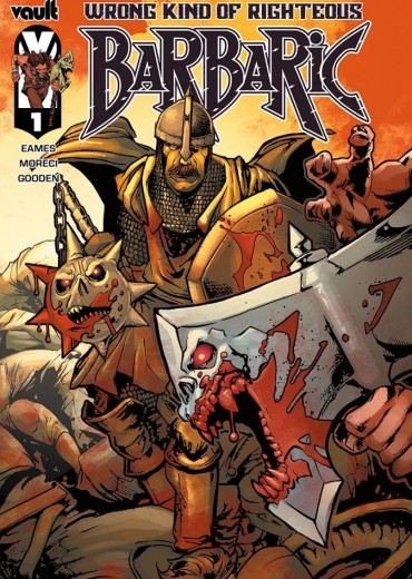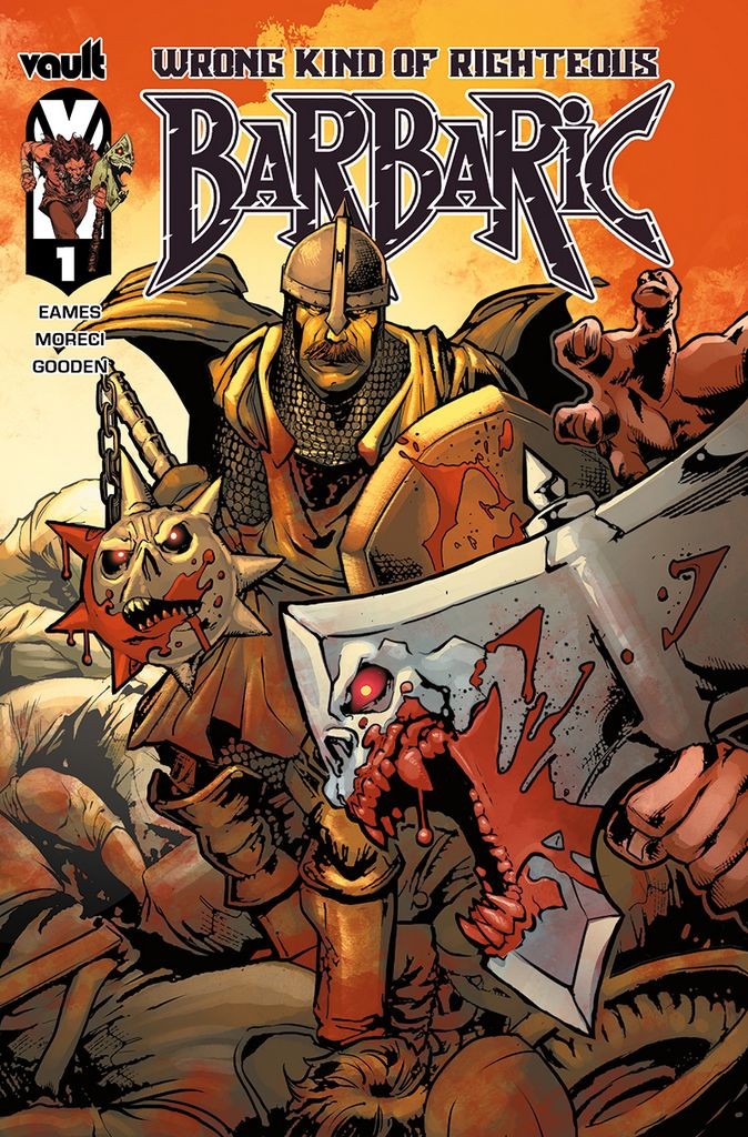 Double-sized one-shot introducing an all-new talking weapon, Flail! Best-selling, Gemmell Award-winning Fantasy author Nicholas Eames (Kings of the Wyld) teams up with Michael Moreci, Nathan Gooden, and Julius Ohta to tell the tale of Sir Borys the Righteous Paladin and his trusty, talking Flail, as he enlists the help of Owen, Axe, and Soren on his noble path. There will be virtuous bloodshed! There will be wailing protests! There will be two talking weapons! And there will be wyvern burgers served (for better or worse) with pickles!