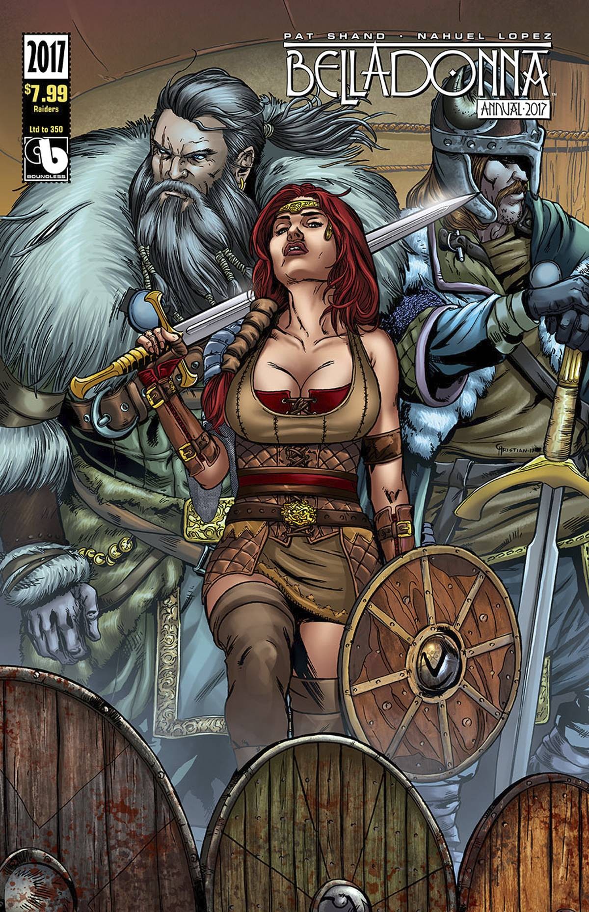 The redhead raider and her shield maidens are back! This Annual sets the stage for the new series starting this Fall with two all-new stories. Belladonna and her warriors are lured into a trap by the Bone Queen while Gypsy has to escape a hostile pack of werewolves! Available with all-star covers including a Regular Cover by series artist Nahuel Lopez, Wraparound by Raulo Caceres, Shield Maiden by Matt Martin, Sultry Slayer and Killer Body by Renato Camilo and a painted Viking Vixen from Jonatas! A special subset of Raiders covers are available by Christian Zanier, each limited to just 350 copies! Including the Raiders, Nightfall, Topless, Nude, Adult and Adult Extreme covers on this special run series of images. For the erotic art collectors, there is a special Gypsy Wraparound Nude by Paulo Siquiera that has no clothed edition. We also offer a Century Nude (limited to 100 copies) featuring original pencils by Renato Camilo, as well as the Nude by Lopez, Wraparound Nude by Caceres, Shield Maiden Nude and Adult by Matt Martin, Sultry Slayer Nude and Killer Body Nude by Renato Camilo and a painted Viking Vixen from Jonatas (which is a totally different image from the clothed edition). To see the uncensored nude and adult covers, please visit www.boundlesscomics.com.