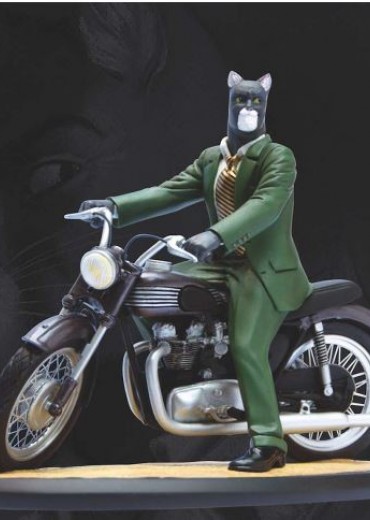 Beeldje van Blacksad op moto. gelimiteerd op 2000 ex. Hoogte 18 cm Volledig in Porselein en Metaal. Met de hand geschilderd en afgeleverd met certificaat van echtheid.