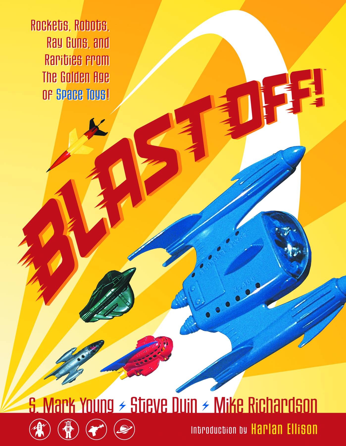 S. Mark Young (W), Steve Duin (W), and Mike Richardson (W) Back in print in softcover, Blast Off! chronicles the golden era of space toys, featuring hundreds of color photos of these beautiful and sometimes bizarre playthings, plus prototypes, original packaging and instructions, catalogs, advertisements, vintage comic-strip and pulp-magazine art, and more from every corner of the globe. An essential resource for the collector or anyone with an eye for pop culture and the love of fun!