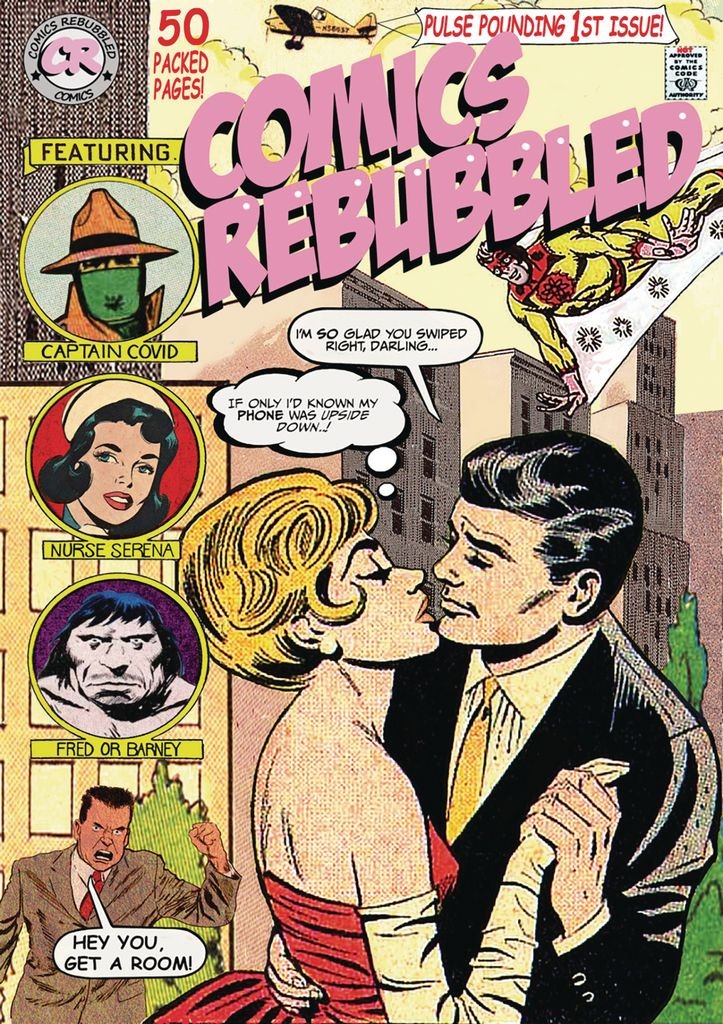 The first ever edition of a new genre of comics. The authors have taken public domain comics from the 1940's, 50's and 60's, rewritten the captions and dialogue to create completely new stories with a comedic twist. The result is a hilarious and unique collection of re-purposed comic tales illustrated by the great names of the Golden and Silver Age. Root for superhero Scott Gigawatt who defeats the forces of evil by singing uncool Country and Western songs which cause his adversaries to explode. Thrill to the adventures of Captain Covid, the world's first socially distanced detective as he tries saving the world from a more lethal strain of COVID-19 by punching a lot of people in the face. Worry for Laverne, the good blonde gone bad as she ditches her sleazy-rider boyfriend Brandon and kickstarts a new relationship with a handsome shaman in a polo-neck sweater. And shiver in fear as Frank and Gina find themselves dragged back to the 18th century and discover, to their horror, that there is no 5G phone coverage. Comics Rebubbled takes stories of raw human emotion and peril-and treats them with disdain and disrespect. It's new, it's different, it's irreverent-and it's funny.