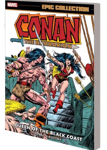 In these pages Conan meets the Queen of the Black Coast in one of the most captivating pairings in comics! But first, he teams up with Red Sonja in one of Roy Thomas and John Buscema's finest tales! Then, Conan's travels through the western wastelands bring readers the tear-jerking 'Last Ballad of Laza-Lanti,' the fearsome threat of Shokkoth and a flashback tale of from the Cimmerian's youth! Next, the saga of Lupalina the Wolf-Woman takes Conan to the castle keep of the death-dealing Unos! Along the way, Conan picks up sidekicks Yusef and Tara and comes face-to-face with his biggest challenge: himself! We conclude with the debut and origin of Bêlit, the pirate queen that would become Conan's partner in love and war. Collecting CONAN THE BARBARIAN (1970) #43-59 and material from SAVAGE SWORD OF CONAN (1974) #1. Rated T+