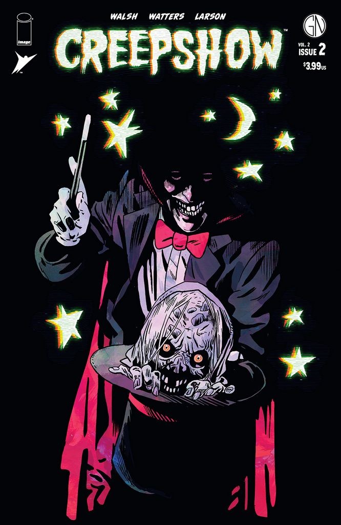 'CREEPSHOW is back with two more terrifying tales! First, MICHAEL WALSH (THE SILVER COIN) broadcasts a chilling yarn about a down-on-his-luck dad and his son's obsession with TV in ''The Man With No Eyes''! Then, DAN WATTERS (HOMESICK PILOTS, Arkham City) and Hugo Award-winning illustrator ABIGAIL LARSON (Sandman Universe: The Dreaming) will render you speechless with the story of a young woman burdened and the price she'll pay for silence in ''Stop Haunting Me''!'