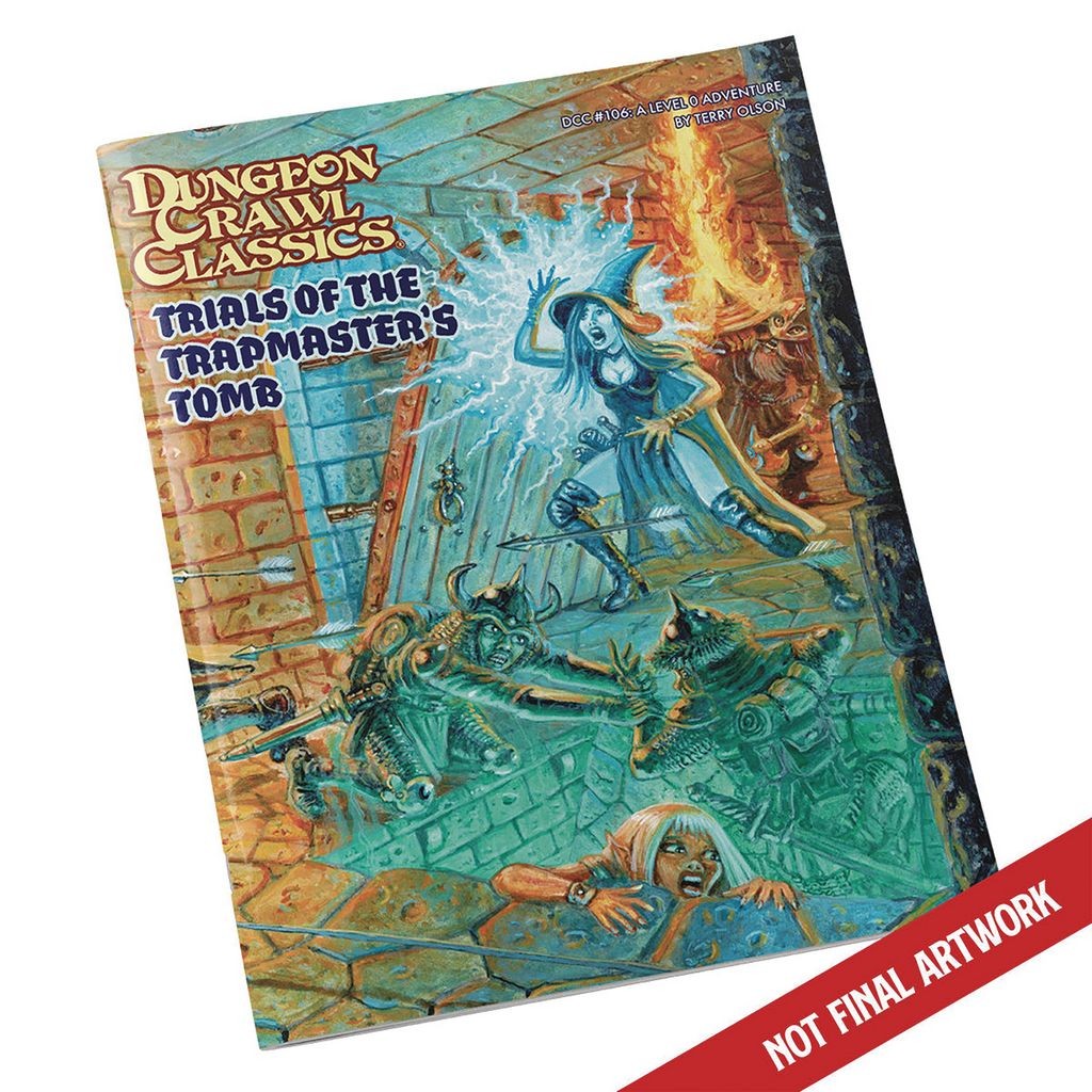 Goodman Games presents DCC #106 Trials of the Trapmaster's Tomb. The tomb of an infamous trap-maker and necromancer opens once each year, giving desperate souls seeking fortune and glory the chance to challenge their wits against the Trapmaster's deadliest creations and deathless guardians. Few come out alive, but those who do, go on to become heroes. This is a 0-level funnel adventure for Dungeon Crawl Classics RPG. This trap-centric adventure will challenge both the players and their characters with a plethora of death traps and supernatural foes. The toll will be high, but the fortunes to be claimed by the survivors is vast.