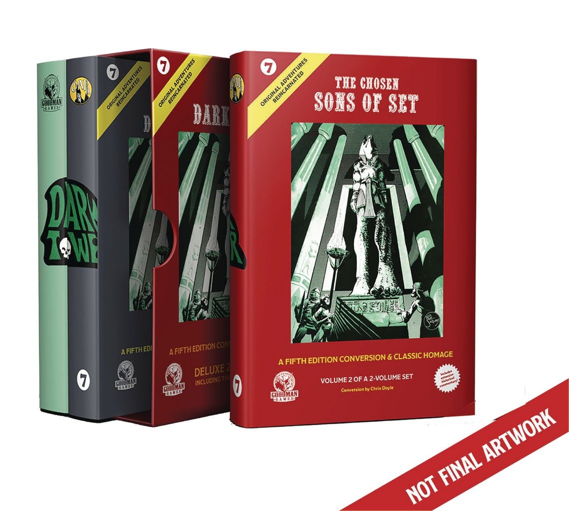 Goodman Games presents Original Adventures Reincarnated #7, Dark Tower. Untold riches, ultimate power, undying glory, and gruesome death can all be found herein! Dark Tower is an homage to the classic adventure and is a full 5E conversion, plus additional all-new material. A three-volume set presented in a slipcase, these books contain a reprint of the original adventure plus essays from industry luminaries (Volume 1), a full 5E conversion of the classic adventure (Volume 2), and three brand-new adventures, The Chosen Sons of Set (Volume 3). This sprawling campaign is suitable for 7th-level and higher characters and can be easily dropped into your own setting.