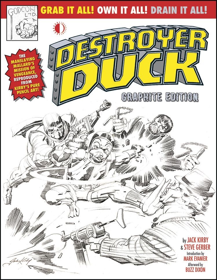 In the 1980s, writer Steve Gerber was embroiled in a lawsuit against Marvel Comics over ownership of his creation Howard The Duck. To raise funds for legal fees, Gerber asked Jack Kirby to contribute to a benefit comic titled Destroyer Duck. Without hesitation, Kirby, in his own dispute with Marvel at the time, donated his services for the first issue, and the duo took aim at their former employer in an outrageous five-issue run. With biting satire and guns blazing, Duke 'Destroyer' Duck battled the thinly veiled Godcorp (whose infamous credo was 'Grab it all! Own it all! Drain it all!'), its evil leader Ned Packer and the (literally) spineless Booster Cogburn, Medea (a parody of Daredevil's Elektra), and more! Now, all five Gerber/Kirby issues are collected. relettered and reproduced from Jack's unbridled, uninked pencil art! Also included are select examples of Alfredo Alcala's unique inking style over Kirby on the original issues, Gerber's script pages, an historical Introduction by Mark Evanier, and an Afterword by Buzz Dixon.