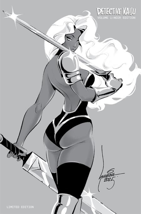 This limited edition version of Detective Kaiju vol.1 collects the black & white "Noir" Editions of Detective Kaiju #1/4 and features a B&W variation of Sveta Shubina’s iconic cover art. This cover artwork will not be printed again outside of this limited to 1954 copy release. From the pages of the fan/favorite series “Quested” comes a noir comic of epic proportion! Detective Kaiju the hardboiled investigator gets his own mini/series with Quested’s Michael Calero (American Psycho) and Kit Wallis (High On Life) reuniting on the 3 part murder mystery. In this debut issue, Detective Kaiju’s past catches up with him when the body of an old friend is discovered in South Faerbraun. Now he must face the demons of his past while investigating the unusual murder.