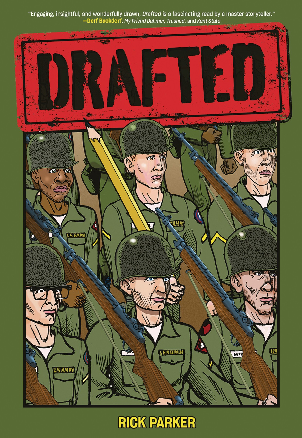 Drafted is a graphic novel memoir by Rick Parker, a shy, inexperienced, and overly protected teenager who gets drafted into the United States Army at the height of the Vietnam War. The looming threat of deployment informs every aspect of his life, from the most ludicrous experiences to the grimmest tests of endurance. Initially determined to do his patriotic duty, Parker gradually comes to the realization that he is just not cut out for a military career and wants nothing more than to serve his time and return to civilian life to pursue his dream of becoming an artist. In telling this story, he shows how Vietnam was the last war in the United States that instituted the draft; how the draft affected those who served; and how we as Americans think of war and our soldiers once they return from service. Parker also shows how being an artist helped him to survive his time in the army.