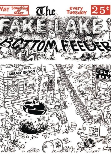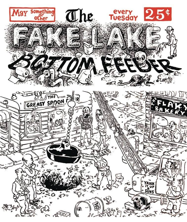 The town of Fake Lake is a sludge pit of goings on and the Fake Lake Bottom Feeder (the local paper) has been kept busy chronicling what amounts to a mild apocalypse: collapsing bridges, a gap in the street that swallows the high school band, an awful bacterial business at the hot springs and a great blowout at the Fakeola bottling plant. Fake Lake is a replica of a weekly edition of the paper, complete with Children's Section (try not to freak out Trippy the clown), Industrial News (it's work injury week, again), a fulsome Food Section (beware the Flakey Bakery's Sticky Buns) and a special double page spread of the Dregs Coffee Shop's Sponsored Expedition to Ascend Old Frothy (their espresso machine) with exclusive photos of bearded hipster explorer types hip deep in milk foam.