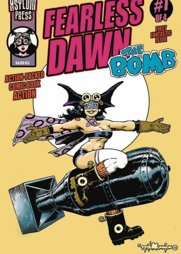 The origin of Fearless Dawn is finally told! This is a great jumping on point for any comic book fans who are not familiar with this funny, sexy, stumbling super-heroine. Learn how the awkward Prissy Jones gets her super-powers and how she creates her own costume of moose elks, action gloves and whoop-ass utility belt!. Fearless Dawn comics have always been about great art and fun frolics and this latest offering is no exception! Artist/writer Steven Mannion whips up some of the craziest comic book tales this side of The Goon and Mad Magazine, This comic was previously offered as the The Bomb TPB from 2010. New art and pages have been added, and previously published pages have been reworked.