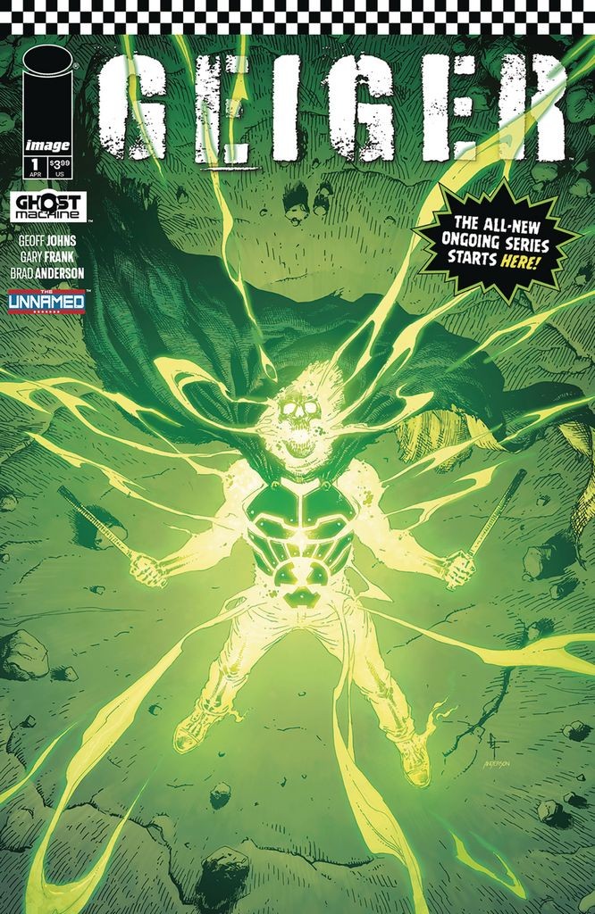 SERIES PREMIERE IT ALL STARTS HERE! The critically acclaimed team of storytellers GEOFF JOHNS and GARY FRANK return to the nuclear wasteland of GEIGER for an ALL-NEW ONGOING series starring the violent and unpredictable GLOWING MAN! Leaving his home behind, Tariq Geiger now walks the radioactive roads of the former United States with his two-headed wolf Barney. But as his enemies doggedly pursue him, Geiger discovers salvation from the unlikeliest of foes. But what secrets does this potential ally hold that could help Geiger? And exactly how many people are after The Glowing Man… and why? Don't miss this vital action-packed chapter in THE UNNAMED saga!