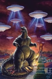 Godzilla: Here There Be Aliens is both a fully standalone limited series and the epic conclusion to the Eisner-nominated Godzilla: Here There Be Dragons trilogy! Brought to us by veteran scribe Frank Tieri (Wolverine, Jughead: The Hunger) and new series artist Angel Hernandez (Star Trek).It's the middle of the 20th century, and Americans everywhere are terrified by the strange lights hovering above them in the night sky…and they should be. These UFOs are actually the Xilien invasion force! Revealed to have already been on Earth during the events of Here There Be Dragons: Sons of Giants, the Xiliens have been attempting to destabilize the planet with the help of kaiju from outer space! With the aliens' claws deep inside the U.S. government, will our rogue operatives manage to band together to save humanity?