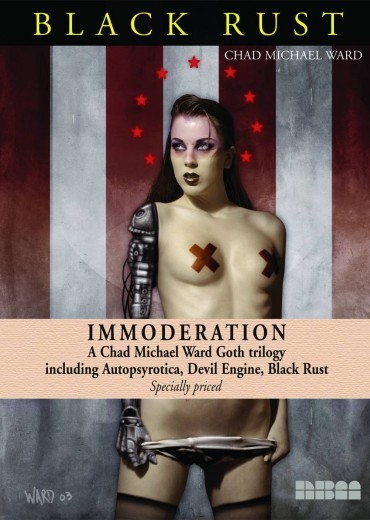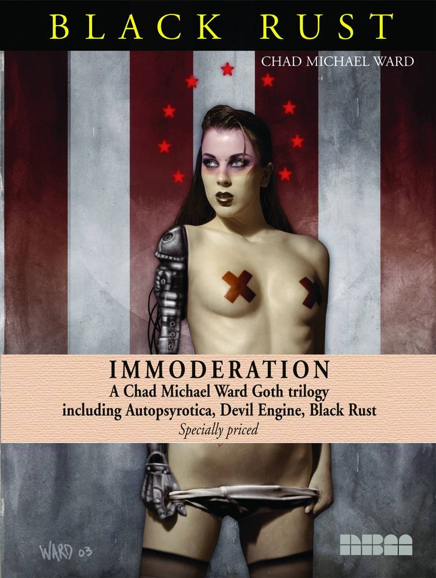 A specially priced banded set of 3 of cult phenom Chad Michael Ward fantasy and conceptual art books - Autopsyrotica, Devil Engine, and Black Rust - offers readers and conoisseurs a collection of images that fit together in a morbid jigsaw puzzle of wires, women, and man-beasts to form a symbolic cyberotic tale of love, redemption and death.