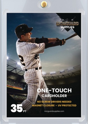 Magnets are the future, and the future is now! Embrace the wonder of magnets and protect the jewels of your card collection with these high-quality one-touch cardholders! Designed for regular-thickness 2 1/2' by 3 1/2' cards, these 35 pt card holders feature UV protection and simple magnetic closures. No screwdriver required! Perfect for high-value cards! Labeled for individual sale, there are 25 card holders in every display, and four displays in every case. An Ironguard Supplies product!
