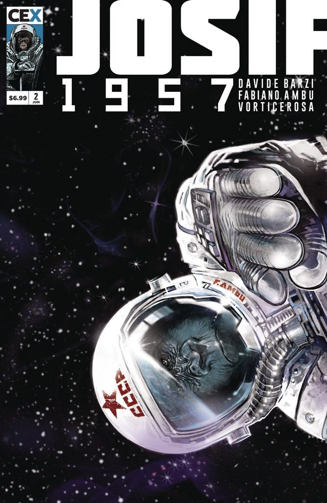 Josif, the first gorilla in space, is wreaking absolute havoc in low orbit, and no one knows how to stop him! U.S. President Dwight D. Eisenhower knows just what to do -- he blasts into space himself to handle the matter! It's a zero-gravity battle between the United States President and the Soviet Gorilla, at the height of the Cold War! Featuring a 1 in 10 variant homage to Blade Runner by Italian super-star Fabiano Ambu!