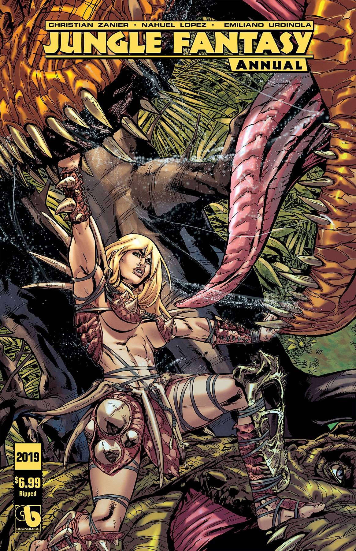 It's all-new, super-sized, jungle goodness unleashed! This 64 page epic tome features three new stories! Azalea set out on her quest to find a downed ship at the end of JFan Secrets, and it leads her to unexplored lands! The fan-favorite Vixens return in a story and this is the first appearance of Tri-Sara by Zanier! Three clone sisters named Sara, never meant to escape into the wild, and they share a special bond. Super-star artists on the stories, as well as these sexy covers: by Christian Zanier (also Nude & Adult on each) + Regular + Tri-Sara Wraparound + Playful + Ripped +Sultry + Luscious + Brutal Adult (& Extreme & Abused). Renato Camilo (also Nude on each) +Battle Babes + Azalea + Natural Beauty + Vixens + special set of ten Century covers. Also, Vixens Wrap (& Nude) by Raulo Caceres - Painted (& Nude) by Joao Silvera - Stunners (& Nude) by Ron Adrian - Vixens Rio Nude by Al Rio. To see the uncensored covers, please visit www.boundlesscomics.com.