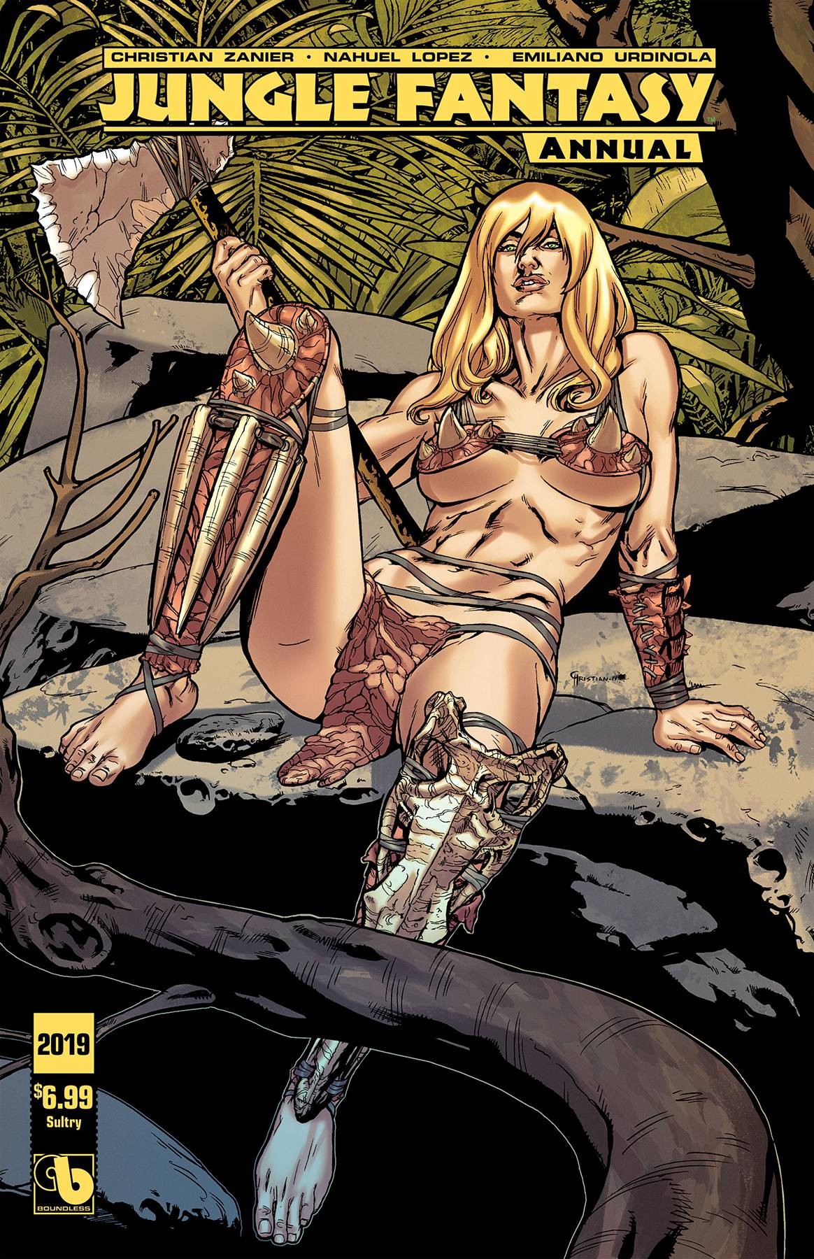 It's all-new, super-sized, jungle goodness unleashed! This 64 page epic tome features three new stories! Azalea set out on her quest to find a downed ship at the end of JFan Secrets, and it leads her to unexplored lands! The fan-favorite Vixens return in a story and this is the first appearance of Tri-Sara by Zanier! Three clone sisters named Sara, never meant to escape into the wild, and they share a special bond. Super-star artists on the stories, as well as these sexy covers: by Christian Zanier (also Nude & Adult on each) + Regular + Tri-Sara Wraparound + Playful + Ripped +Sultry + Luscious + Brutal Adult (& Extreme & Abused). Renato Camilo (also Nude on each) +Battle Babes + Azalea + Natural Beauty + Vixens + special set of ten Century covers. Also, Vixens Wrap (& Nude) by Raulo Caceres - Painted (& Nude) by Joao Silvera - Stunners (& Nude) by Ron Adrian - Vixens Rio Nude by Al Rio. To see the uncensored covers, please visit www.boundlesscomics.com.