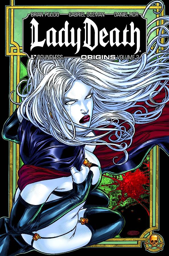 Cover: Juan Jose Ryp Writer: Brian Pulido Art: Gabriel Guzman, Daniel HDR Boundless Comics proudly collects, for the first time ever, the complete origin of fan-favorite comics heroine, Lady Death! In this second volume, a young woman once named Hope - who recently renounced her humanity to become a cold yet alluring warrior - pursues the evil warlock Sagos in an attempt to free her mother's kidnapped soul. Allying herself with the mysterious duo, Wargoth and Satasha, she begins to understand the dark powers she wields� but will it be enough to face her enemy's very skilled and very deadly lieutenants? LADY DEATH ORIGINS VOL. 2 collects the all five issues of 'Blacklands' and three issues of 'Sacrilege' story arcs in their entirety, as written by original creator Brian Pulido. Available in softcover format with illustrated cover by Rafa Lopez, a Hardcover by Juan Jose Ryp that is limited to 2500 copies, and a special Signed Hardcover with a new cover from Richard Ortiz and featuring a signature plate from creator and writer of Lady Death, Brian Pulido that is limited to 1000 copies!.