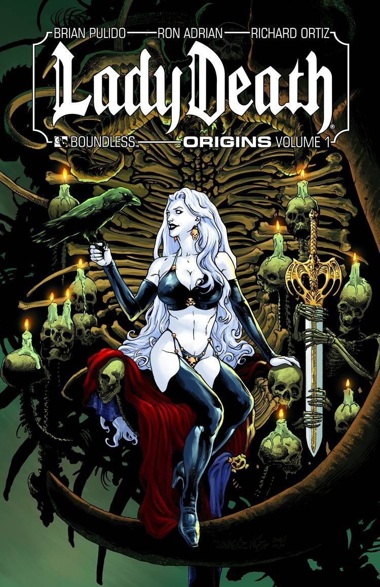 For the first time ever, Lady Death's previous tales are being collected in this new series of graphic novels, Lady Death: Origins! With tons of breathtaking adventures that are, until now, out of print, the Lady Death: Origins series is a perfect way for fans to see what has come before the new Boundless monthly series! This first volume collects the epic five-issue 'Abandon All Hope' series, which not only tells Lady Death's origin story, but introduces a whole cast of characters, with art from Ron Adrian. Also contained within is the two-issue 'Wicked' series with art by Richard Ortiz. This volume is available in Paperback with a cover by Javier (Crossed) Barreno, a Hardcover by Juan Jose Ryp that is limited to 2,500 copies, and a special Signed Hardcover with a new cover from Richard Ortiz and featuring a signature plate from creator and writer Brian Pulido, which is limited to just 1,250 copies!