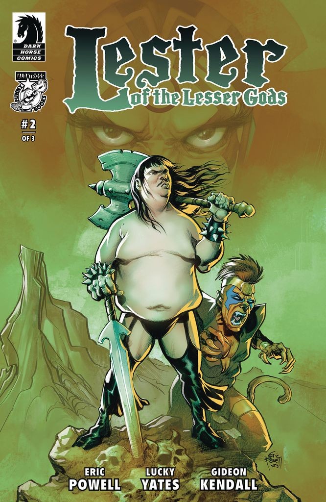 Writers Eric Powell (The Goon) and comedian and voice actor Lucky Yates (TV's Archer) team with Eisner Award-winning artist Gideon Kendall (Megaghost, Marley's Ghost) for the second installment of the twisted comedic groin tap that is, Lester of the Lesser Gods. This episode… SIDE QUEST! Lester and his battle companion, Kathy Stroyer, are pulled away from their assault on the empire of Will Frye the Technomancer Guy to raid a mountain fortress where their automaton pal, Duck Bot, is held captive.