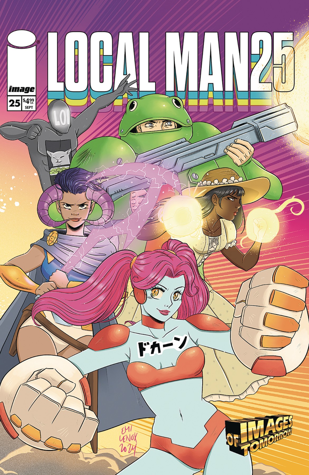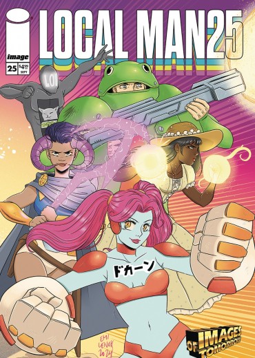 NEW STORY ARC IMAGES OF TOMORROW! Just as the Image Comics line did back in 1995, LOCAL MAN jumps ahead a full year to give you a glimpse of what the future brings, from issue 13...to 25!Third Gen is back with a vengeance! Their first mission? Bring down the reckless young superheroes of Fourth Gen! But will Local Man side with the Zoomers? Or will he help take them down in exchange for getting back the shield and uniform of...CROSSJACK?!The past, present, and future of the Image Universe collide hard in LOCAL MAN #25! On the flip! A corporate retreat at Third Gen HQ leads to...beach volleyball?