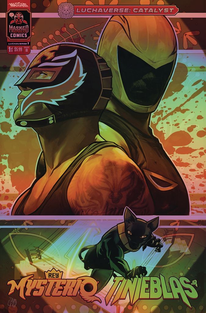 This cover by Francesco Tomaselli, who has worked with publishers such as Image Comics, BOOM! Studios, Source Point Press, ABLAZE Publishing, Heavy Metal Magazine, Scout Comics and many more, is available through Massive Select as a foil variant. It all starts here with the three-part launch of the epic new shared Luchaverse! The world's most famous luchadores battle in the ring by day, and serve humanity as monster hunters and world protectors by night. In this series, Masked Republic Comics and Massive Publishing bring back the glory and tradition of real-life lucha libre stars in comic books, setting the stage for a new era filled with epic cross-genre action in a shared universe. The first installment of the Luchaverse series is an action-packed double feature that is a perfect entry point for both long time fans of luchadores and new readers looking for genre bending adventure and universe altering mystery. First, Rey Mysterio, the world's most recognizable luchador discovers his legacy outside of the ring as the next in line to take on a great evil prophesied to return and plunge the world into darkness… Next, as heir to his own legacy as lead luchador monster hunter, Tinieblas Jr. takes on the legions of the damned and all manner of creatures that go bump in the night while trying to prevent ancient forces of the monster realm from conquering the universe!