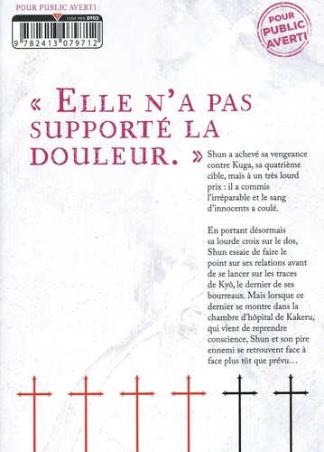 "ELLE N'A PAS SUPPORTE LA DOULEUR". Shun contre Kuga, ce sa quatrième cible, mais à un très lourd prix : il a commis l'irréparable et le sang d'innocents a coulé. En portant désormais sa lourde croix sur le dos, Shun essaie de faire le point sur ses relations avant de se lancer sur les traces de Kyô, le dernier de ses bourreaux. Mais lorsque ce dernier se montre dans la chambre d'hôpital de Kakeru, qui vient de reprendre conscience, Shun et son pire ennemi se retrouvent face à face plus tôt que prévu...