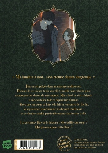 Après The Broken Ring , découvrez une nouvelle romance adulte chez KILY ! Un appartement miteux, une dette abyssale, un mariage chaotique. Le quotidien morose de la studieuse Hae Su va-t-il être changé par un jeune homme qui semble désespérément rechercher son affection ? Romance, fleurs et rendez-vous galants... Il fut un temps où cela décrivait parfaitement Hae Su et Mincheol. Aujourd'hui, il ne reste qu'une dette abyssale et un mariage chaotique : et le monde de Hae Su s'écroule quand Mincheol la trompe avec une jeune collègue. Alors que son coeur se fane, elle fait la rencontre d'un mystérieux jeune homme à la beauté foudroyante... La vertueuse Hae Su saurait-elle braver les interdits ?
