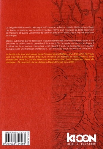 La brigade d'élite a enfin débusqué la Couronne de fleurs, mais la fillette est protégée par Akira, un guerrier qui semble invincible. Même Zoé n'est pas de taille contre un tel monstre, et quand Luka tente de venir en aide à son amie, c'est lui qui se retrouve en danger... Blessé, submergé par le désespoir, le jeune homme fait inconsciemment appel à ses pouvoirs et prend pour la première fois le contrôle de soldats ennemis, les forçant à retourner leurs armes contre leur chef. Quant à Zoé, sa puissance est soudain décuplée par une floraison inattendue... Est-ce assez pour renverser la situation ? La lumière du son, seul espoir dans l'horreur des batailles... D'un trait vif et nerveux, une nouvelle génération d'auteurs invente un monde de dark fantasy sans concession. Mais ici, pas de héros surdoué au combat, juste un garçon rêvant de musique... Et pourtant, de ses talents dépend l'issue du conflit !