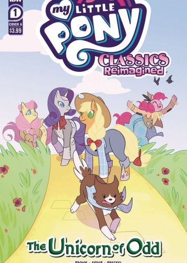 In the second installation of IDW's My Little Pony: Classics Reimagined line, L. Frank Baum's The Wonderful Wizard of Oz gets pony-fied! Travel through all of Odd with Applejack as Dorothy, Pinkie Pie as Scarecrow, Rarity as Tin Woodsmare, and Fluttershy as Cowardly Lion. In issue #1, Dorothy lives an ordinary life at her farm in Ponyville, Kansas, with her Uncle Henrie and Granny Em. But a tornado whisks her away to a magical land of Breezies, silver horseshoes, and good and evil princesses. It almost makes her want to sing... (But she won't. Those songs aren't in the public do-mane.)