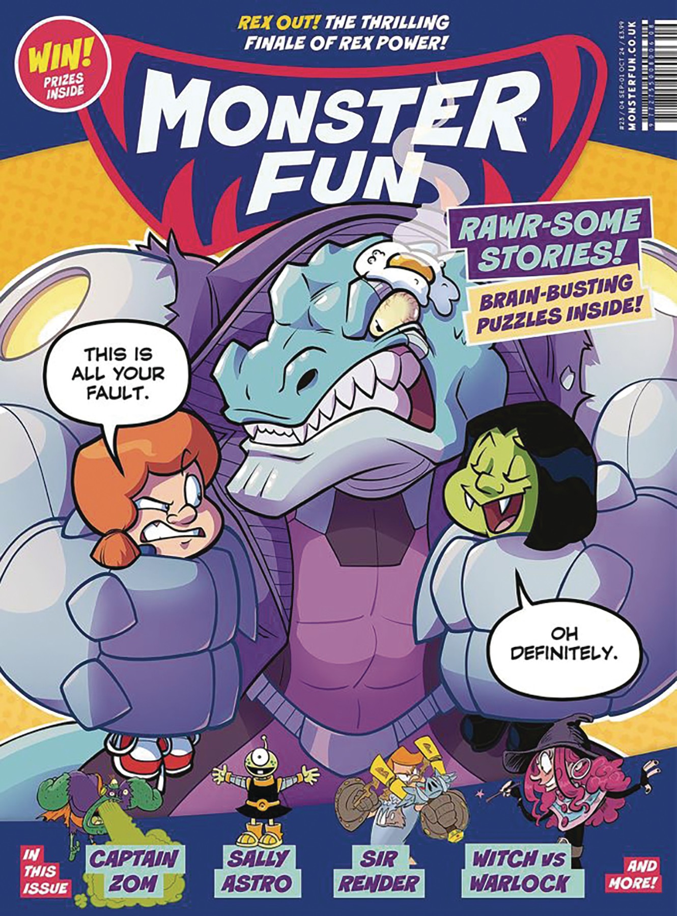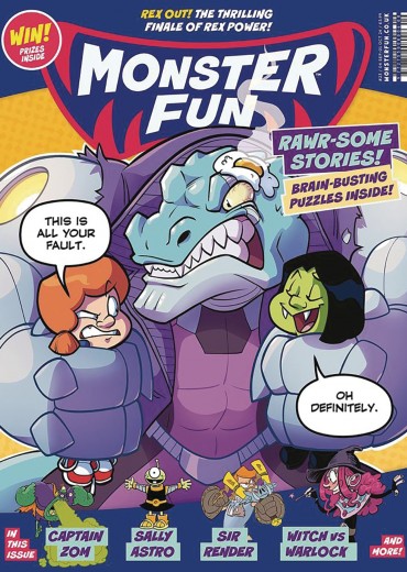 If you're full of the end of summer blues, we have the perfect antitdote for you! The September issue of Monster Fun is jam-packed with beastly belly laughs and out of this world action! Gums, Kid Kong, Sally Astro, Captain Zom, Sir Render, Witch Vs Warlock and Martha's Monster Make-Up, return to turn your frowns upside down! The Hire A Horror crew clock in for another Fright Shift. And finally, we have the thrilling conclusion to Rex Power! It's Korey and Rex versus Zardax, and the stakes couldn't be any higher!
