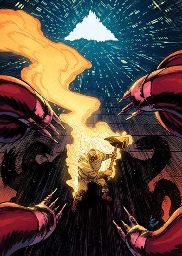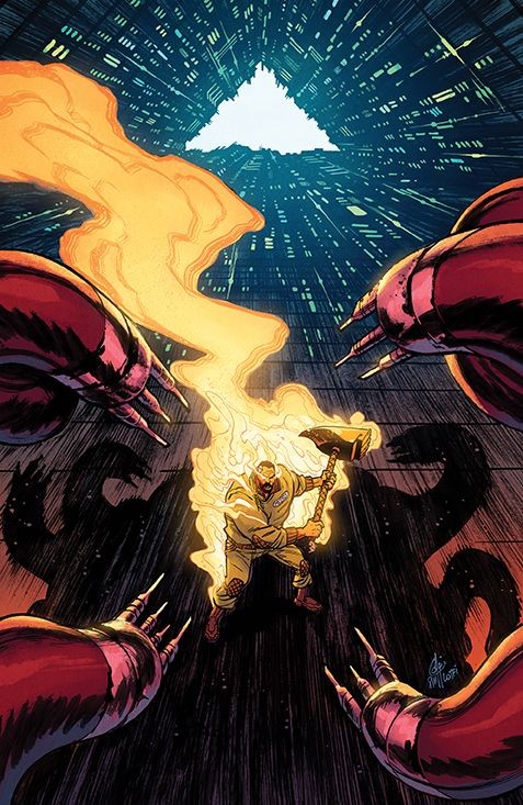 As Mosely reels from the recent events that bestowed the Holy Hammer upon him, he's overwhelmed by the legions of 'upgraded' civilians, with Robo-Enforcers hell bent on keeping the digital status-quo in place. Mosely finds himself with more tangible foes, but a daunting task-wreck the three robo-gods that run the city from their towering pyramids and… deal with the return of someone special from his past? Beginning here, each issue includes a bonus story written and drawn by Rob Guillory for wall-to-wall content!