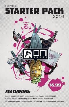 The Oni Press Starter Pack 2016 collects seven complete first issues from Oni Press's acclaimed creator-owned series. Try out new titles or reconnect with your favorites in one giant-sized volume for one low price. WHAT'S INSIDE: Cullen Bunn and Brian Hurtt's THE SIXTH GUN #1 Charles Soule, Alberto Jiménez Alburquerque and Guy Major's LETTER 44 #1 Joshua Hale Fialkov and Joe Infurnari's double-size THE BUNKER #1 Zander Cannon's KAIJUMAX #1 Greg Rucka, Justin Greenwood, and Ryan Hill's STUMPTOWN #1 Cullen Bunn, Joëlle Jones, and Nick Filardi's HELHEIM #1 Joshua Hale Fialkov and Gabo's EXODUS: THE LIFE AFTER #1