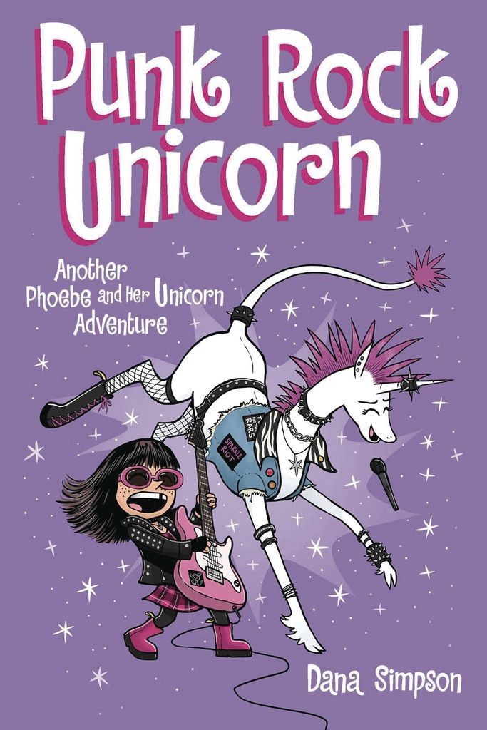Phoebe Howell and her unicorn best friend, Marigold Heavenly Nostrils, are headed to music camp for the summer, where they form a punk rock group with fellow campers Sue and Stevie. Marigold also discovers a portal to a parallel dimension where she and Phoebe come face-to-face with the dark and sinister versions of themselves. Throughout their magical and musical adventures, the best friends learn about the value of friendship, following your heart, and rocking your hardest in this sparkling new collection of Phoebe and Her Unicorn comics by award-winning author Dana Simpson.
