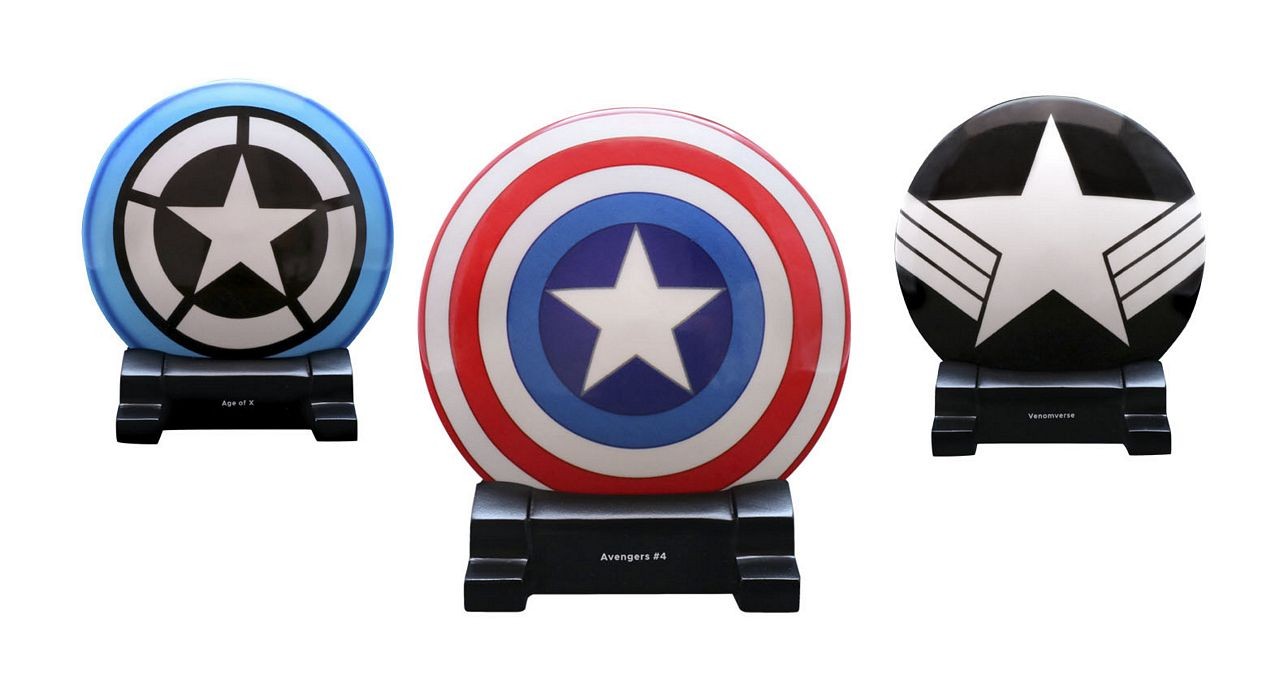 When Captain America throws his mighty shield, you just gotta collect them all! This collection of approximately 4-inch diameter shields spans the entirety of Cap's comic book career, from the war years to his Venomized present! Each porcelain shield comes blind boxed, in an 8-piece pop-up display, with one each of eight different styles to collect. A Toy Sapiens product!