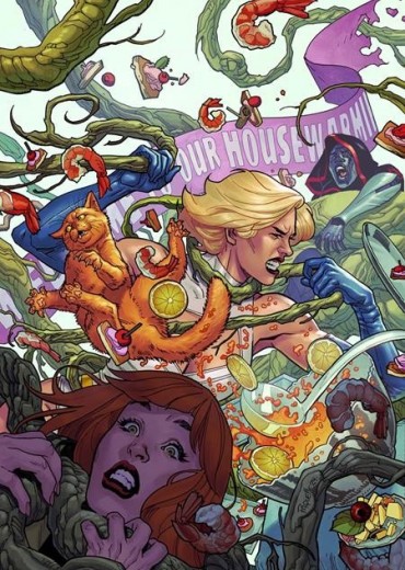 'POWER GIRL GETS PREHISTORIC! Power Girl's throwing a housewarming party! But it's soon crashed by ecoterrorists who desire a return to the days when nature flourished without technology. Before she can pause the music and show them the door, they detonate a magic bomb--that takes everyone back to the prehistoric age!'