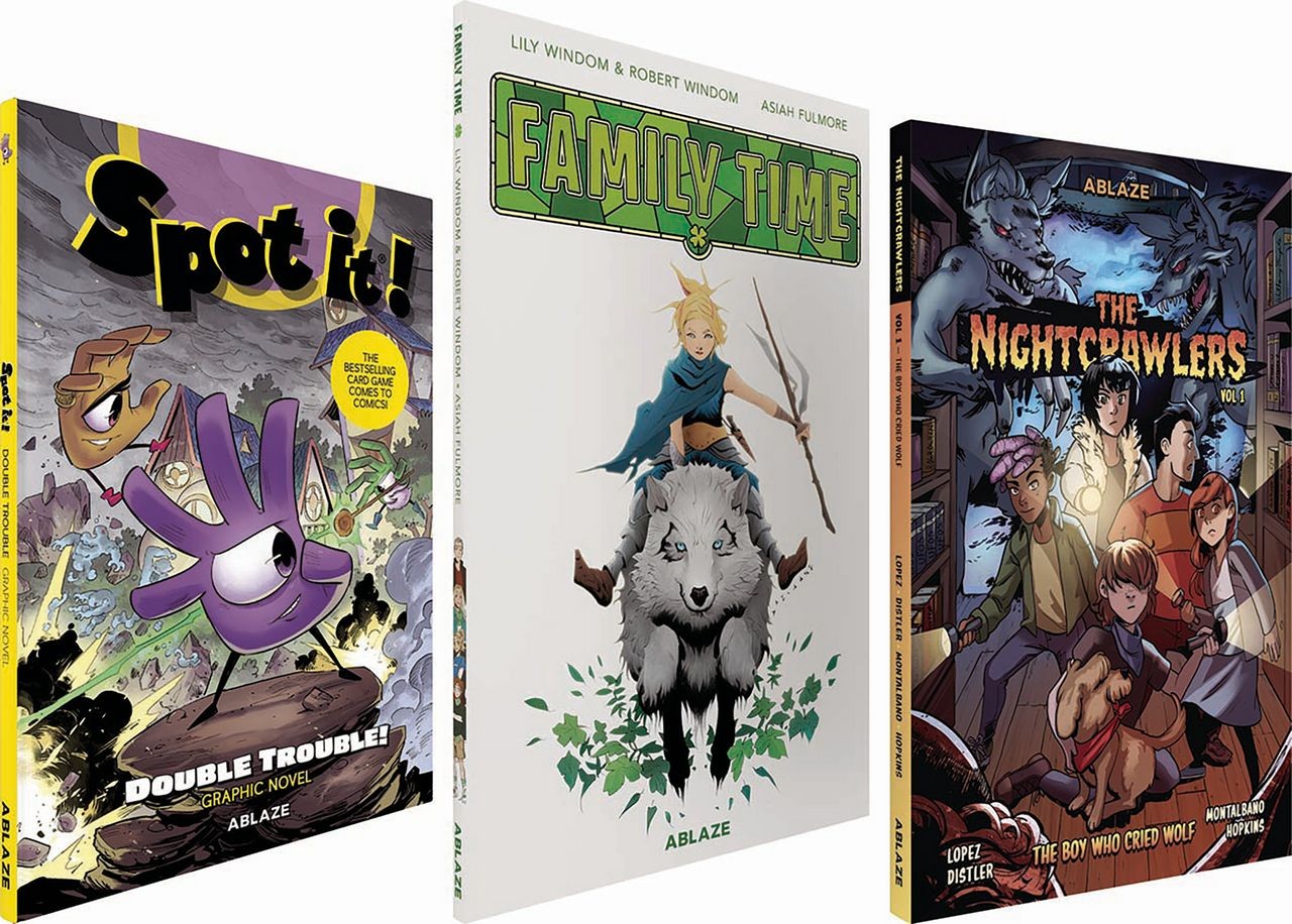 ABLAZE is shining the spotlight on the wide variety of genres and fantastic works within our catalogue! Our Spotlight on Kids' Stories includes three comic titles - Family Time, The Nightcrawlers, and Spot It: Double Trouble - bundled together under a specially discounted price. In Family Time:The O'Connell family (Lily - age 13; Tyler - age 11; and their parents) are vacationing in Ireland when they encounter an old man with a mysterious crystal that seemingly teleports them 1,000 years back in time. Unsure whether they have stumbled into a historical re-enactment, the family must befriend Rory, a timid local, battle a medieval tyrant named Ciaran and his henchmen, and figure out how to get back to the present, while Lily learns to use her newfound superpowers. In The Nightcrawlers: When things go bump in the night, they bump back. If you think aliens replaced your teachers or your neighbor might be a vampire, then there's only one group to call for help: The Nightcrawlers. The Nightcrawlers take on their first case when a friend from school believes werewolves replaced his parents. They get more than they bargained for when their investigation leads them into the middle of a confrontation between their caretaker William Jones and a former Nightcrawler out for revenge. This story is about the unlikeliest group of friends coming together to help others...with a spooky twist! A new all-ages, supernatural adventure about a group of supernatural kid detectives, by Eisner Award-winning writer Marco Lopez and artist-on-the-rise Rachel Distler. For fans of Goosebumps, Ghostbusters, The Goonies, and Stranger Things. In Spot It: Double Trouble: Meet Dobbly. He lives in a world filled with wonderful symbols that have power by finding matching pairs. This ne'er-do-well is so excited about his village's Festival of Matching, he can hardly sleep the night before. His impatience gets the best of him, and he finds himself trying to climb the Great Tree that will produce new pairs for the village. He also finds himself falling off the tree and breaking every branch on the way down, ruining the festival. It's now up to the wizard Zadok and his apprentice, the druidess Dea, to find the magical seeds needed to repair the tree. And Dobbly is tagging along for the adventure!