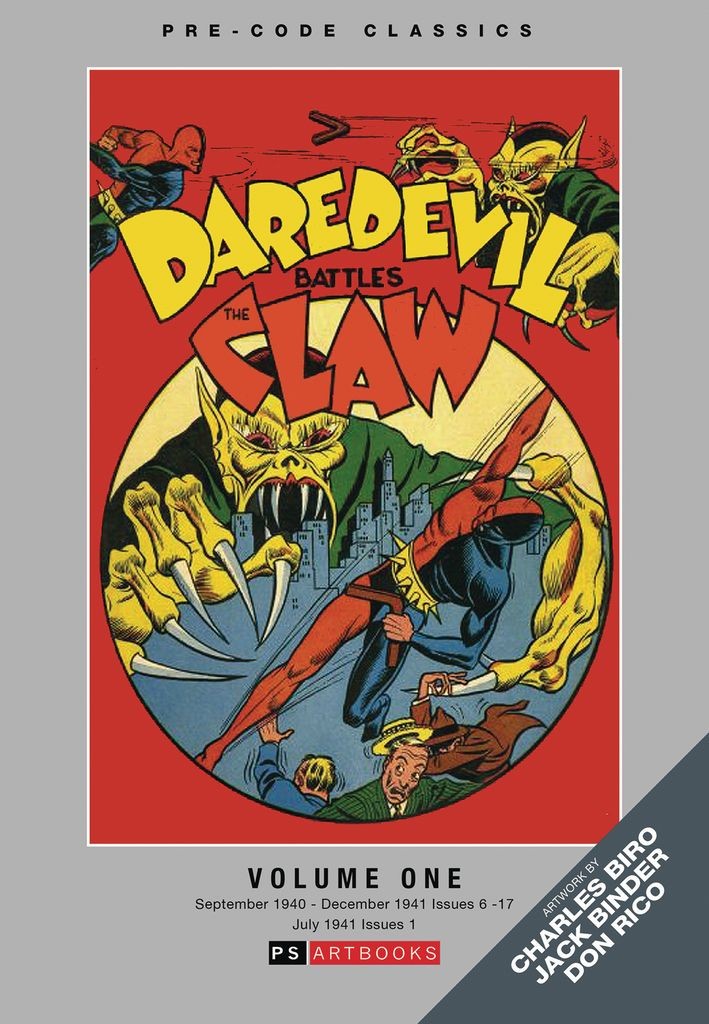 Daredevil is a fictional superhero created by Jack Binder. As a child, Bart Hill was witness to his parents' brutal murder. The murderer also branded Bart with a hot iron, leaving a boomerang-shaped scar on the left side of his chest. This traumatic experience left the boy mute. He trained his entire life in the art of the boomerang, eventually becoming a master boomerang marksman. He then donned a costume and took to the streets as the vigilante crime-fighter known as Daredevil. However... for Bart Hill/Daredevil's second appearance showed him able to speak and it was later revealed that his parents were killed while in Australia, with Bart then raised by a tribe of aborigines who taught him the art of using boomerangs. As an adult, he returned to the U.S. and fought crime as Daredevil. Lev Gleason launched Daredevil's own comic with Daredevil Battles Hitler #1 (July 1941), in which Daredevil and other Silver Streak heroes fought the German chancellor. It was written and partially drawn by Charles Biro, who in his 16-year run would make the character one of the most acclaimed of the Golden Age. Collects Silver Streak #6-17 (September 1940-December 1941) and Daredevil Battles Hitler #1 (July 1941).