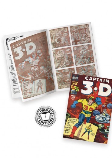 For the first time ever, immerse yourself in the three dimensional worlds of Captain 3D! Created by the masters of comic books Jack Kirby and Joe Simon, Captain 3D is one of the first 3D comic books to be created. Published by Harvey Comics in 1953, this one shot comic is sure to captivate and transport you into the world of D. 3D glasses included with every comic!