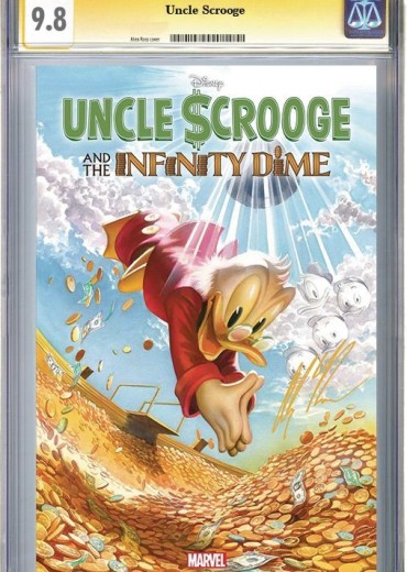 EXCLUSIVE - CGC 9.8 Signature Series, Signed by Alex Ross in GOLD! It's the story you never expected! One of the greatest characters in the history of comics leaps into his most epic adventure yet, in the manner only MARVEL can deliver! When UNCLE SCROOGE'S fabled money bin gets stolen by a shocking culprit, the world's toughest duck must undertake a quest unlike any other, alongside a surprising array of allies: other versions of himself!