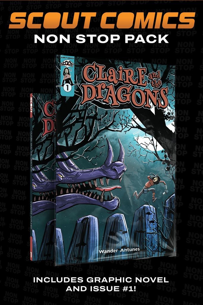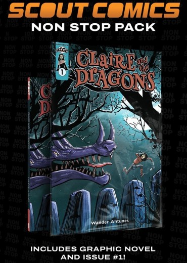 'A NONSTOP/SCOOT collector's pack! This beautifully designed hangable package (measures 8.5 x 12.75) includes a collectible first issue (bagged and boarded) and the complete trade paperback! Claire is a young girl, tough-minded and independent. She isn’t afraid to explore her world—which is how she encountered the old hermit Lontar. That crazy old coot is inspired by a supernatural revelation he had many years ago. He believes that if he leaves a cave where he has lived for many years, the world will be invaded by dragons. He is convinced that he must remain in self-imposed exile until the emergence of a true hero, someone who is capable of leading humanity in the fight against these terrible creatures. Treated as if he were crazy by the local villagers, he relies on Claire to provide for his needs. However, Claire has not yet realized that Lontar believes that she is the fulfillment of the ancient prophecy!'