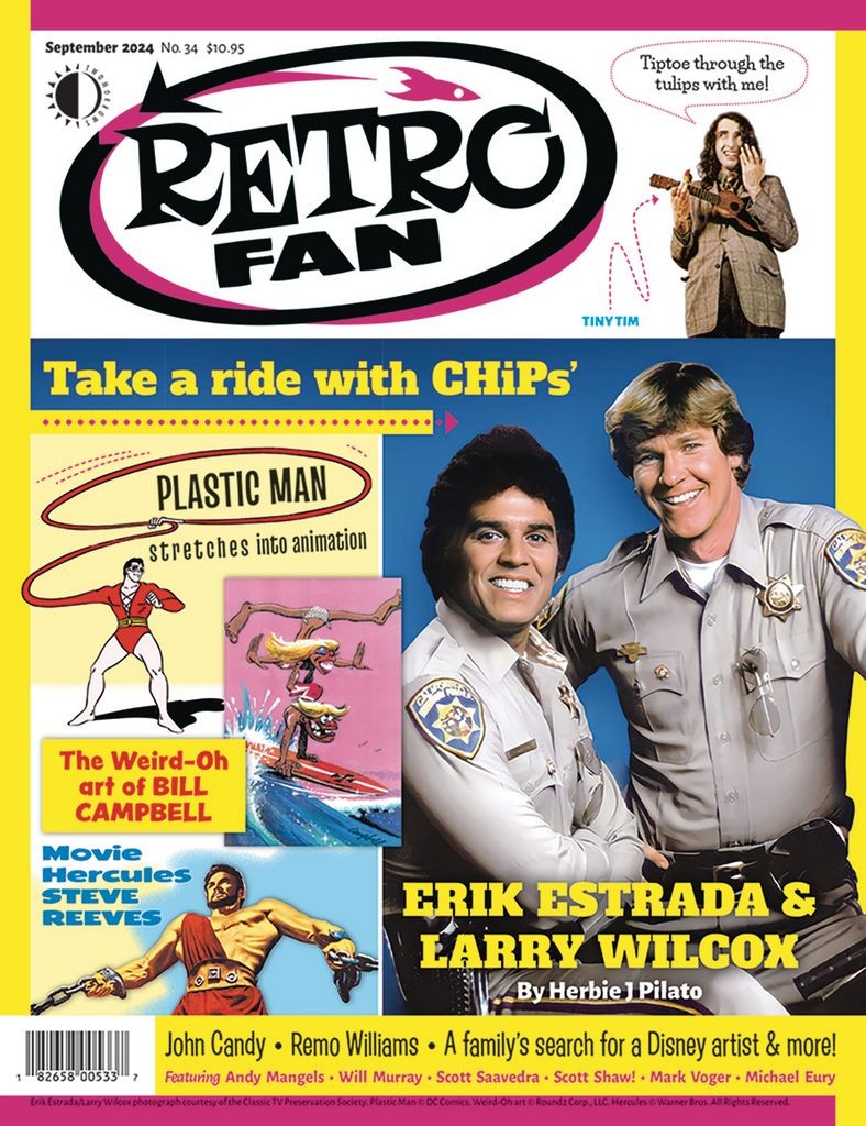 Take a ride with CHiPs' Erik Estrada and Larry Wilcox, courtesy of Herbie J Pilato! Plus: an interview with movie Hercules Steve Reeves, Weird-Ohs cartoonist Bill Campbell, Plastic Man on Saturday mornings, Tiny Tim, Remo Williams, the search for a Disney artist, and more! Featuring columns by Andy Mangels, Will Murray, Scott Saavedra, Scott Shaw, and Mark Voger. Edited by Michael Eury.