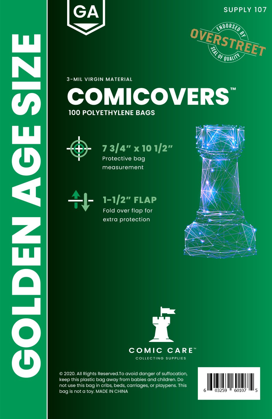 The perfect (and economical!) way to protect your valuable comics! * 100% virgin material * 3 mil. thick * 1 ½' fold-over flap can be tucked in or taped closed * Sold in packs of 100 * 8' x 10 3/4'
