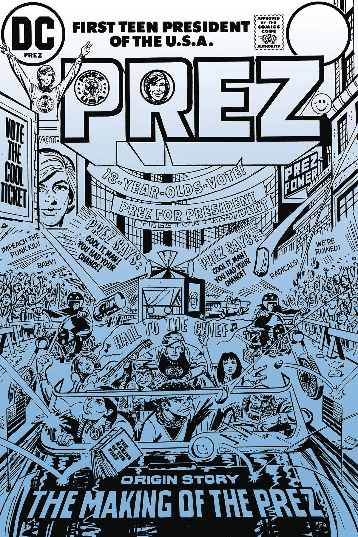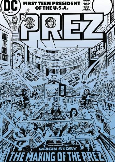 The political career of Prez Rickard, the first teen president of the United States, is collected in a single volume featuring stories from PREZ #1-4, CANCELLED COMICS CAVALCADE and SUPERGIRL #10 (1974), plus unexpected appearances from THE SANDMAN #54, VERTIGO VISIONS: PREZ #1 and pages from BATMAN: THE DARK KNIGHT STRIKES AGAIN #1 and THE MULTIVERSITY GUIDEBOOK #1.