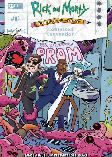 From writers James Asmus and Jim Festante (Rick and Morty Super Spring Break Special, Survival Street) and rising star illustrator Suzi Blake-another day, another final! As Morty's poli-sci exam approaches, he persuades Rick to portal him to President Curtis for some much-needed extra credit. With Curtis is on his way to secure his party's presidential nomination, and Rick determined to prove even the dumbest version of him could beat Curtis, Doofus Rick's hat is thrown in the ring! Competition heats up when Doofus announces Jerry as his VP, and Beth joins the race to become the first woman president. It's gonna be one contested convention!