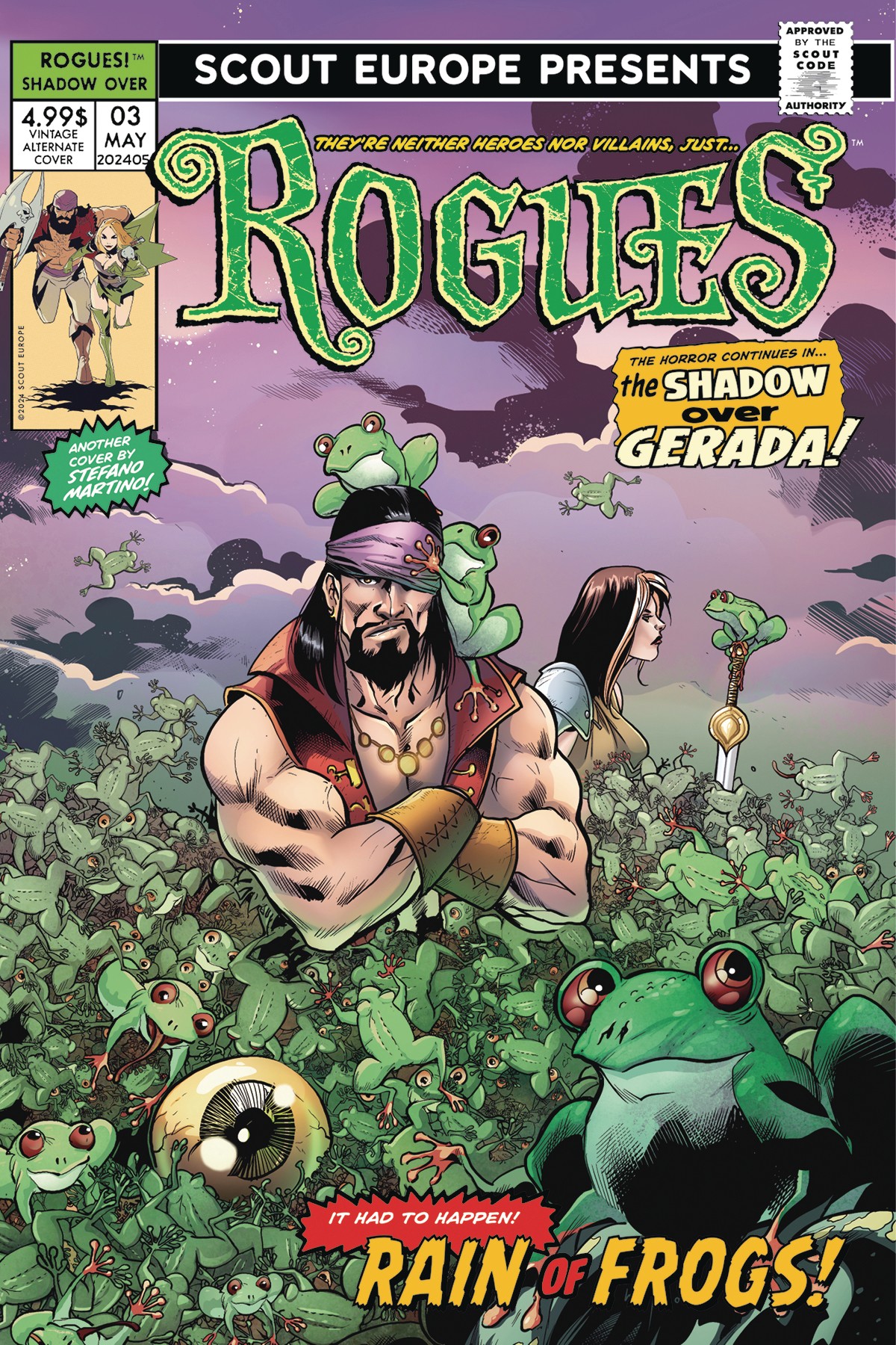 The Rogues face their most eldritch challenge yet! Bram and Weasel forge an unholy alliance with the Mouth of Elders - also called Moe - in a daring quest to retrieve the Necronomicon from the Crypt of the Gods. As Lovecraftian horrors invade Gerada, an ominous omen unfolds and the sky weeps... with a rain of frogs!