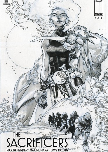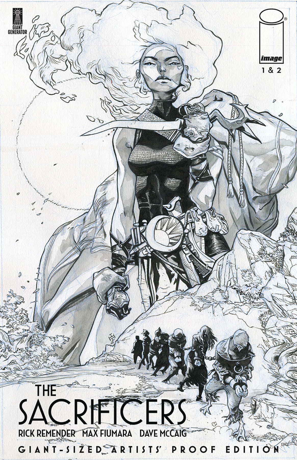 Presenting issues #1 and #2 of the smash-hit fantasy series The Sacrificers by Rick Remender and Max Fiumara in the ultimate artist's proof treatment, showcasing Fiumara's pages in their original inks in stunning 11'x17' format.