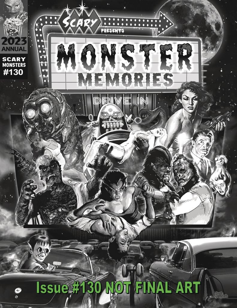 Scary Monsters' 'Monster Memories' issue puts the scary spotlight on drive-in movie theaters, which customarily featured low-budget horror, sci-fi, and fantasy movies enjoyed by Monster Boomers and Monster Kids from coast to coast. We'll also return to the Cosmic Drive-In; get the scary facts behind the murderous pair Burke & Hare; remember masters of dark cinema Wes Craven, Tobe Hooper, and George Romero; and much more!